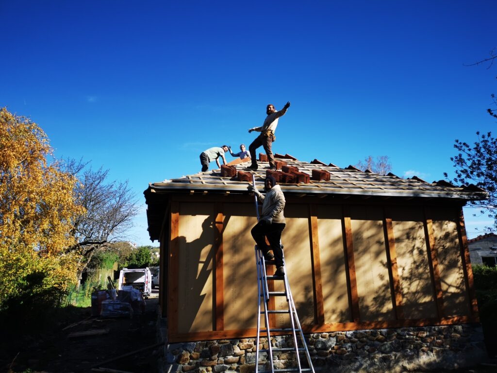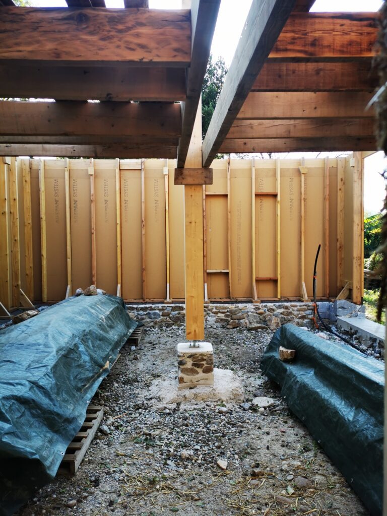 Sur ce projet, il y a des poteaux qui restent visibles, type colombages, la fibre de bois et la paille seront enduites.