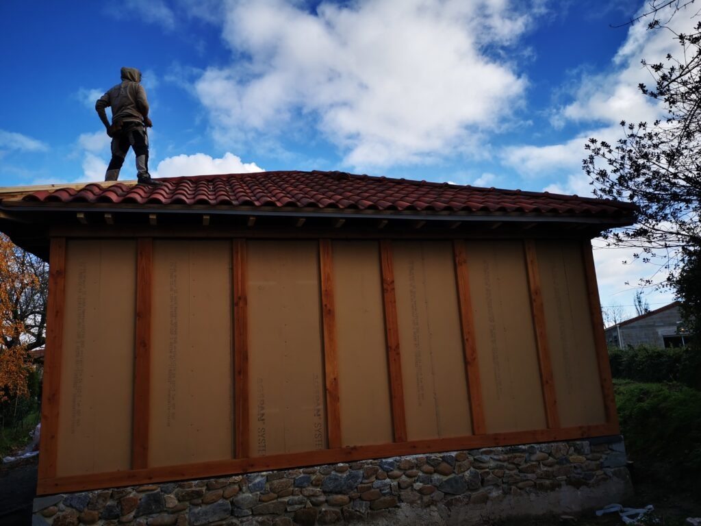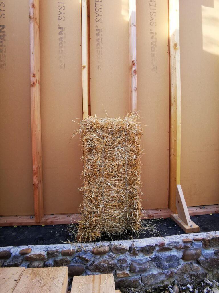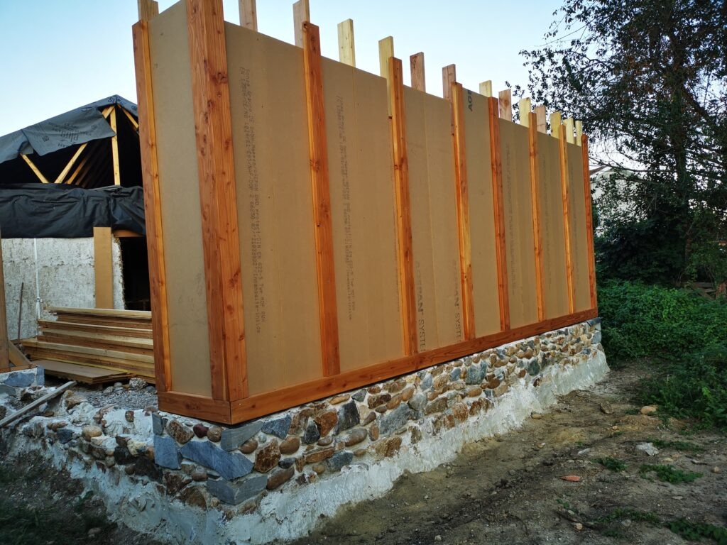 La construction ossature bois consiste à placer des plaques de fibre de bois entre poteaux à intervalles réguliers. L’espacement est calculé en fonction de l’isolant prévu, ici ce sont des bottes de paille rentrées en force.