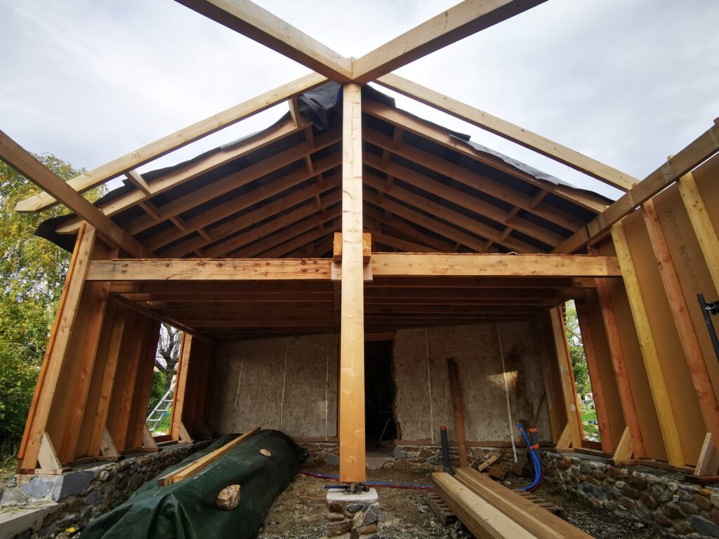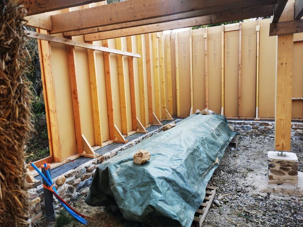 Le principe d’ossature bois nécessite plus de bois que la construction en paille porteuse.