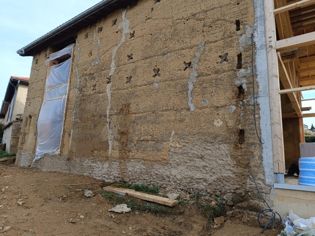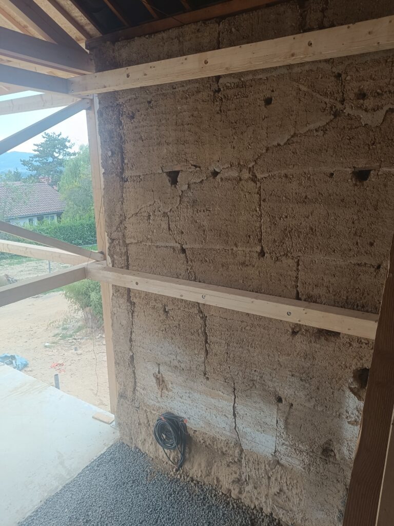 Le pisé existant ayant des fissures traversantes, le bureau structure a préconisé une ossature bois et des croix de st andré de façon à soulager le pisé de ses charges.