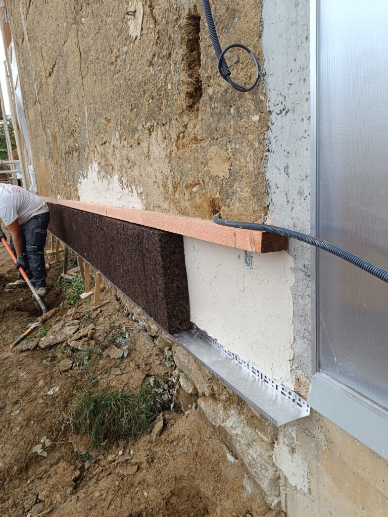L’isolation par l’extérieur est réalisée en COPANO, un panneau de paille de 11.5 cm cousus, prêt à enduire, pour un R=2.74 m².K/W. Il permet de conserver la perspirance de la terre. La pose est collée chevillée afin de répondre aux exigences du bureau de contrôle. Le soubassement est en liège expansé d’une épaisseur de 12 cm sur une hauteur de 50 cm pour un R=3 m².K/W